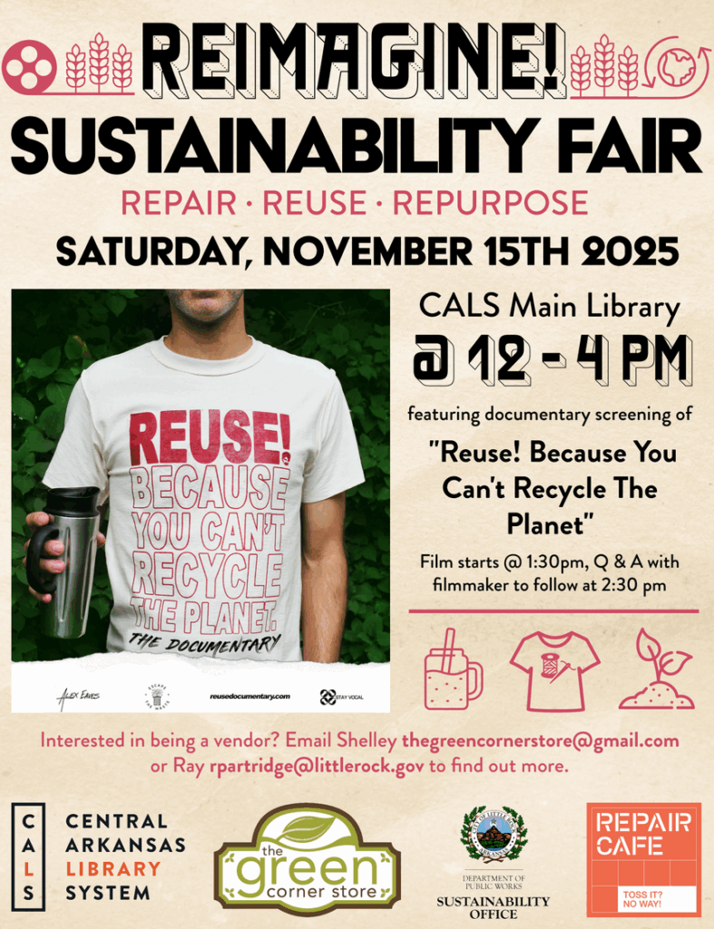 Registration is open for the NAAEE 2025 Conference (November 3–6) and Research Symposium (October 30), hosted online by the Registration is open for the NAAEE 2025 Conference (November 3–6) and Research Symposium (October 30), hosted online by the North American Association for Environmental Education (NAAEE). Join NAAEE and educators worldwide in exploring how we use environmental education to move “Forward Together” to advance environmental literacy and civic engagement. With more than 200 engaging sessions and keynotes, we’ll delve into how education can inspire action, build environmental stewardship, and create healthier, more resilient communities. There couldn’t be a more urgent need to come together, harness our collective wisdom, and keep moving forward. NAAEE 2025 offers a rich variety of sessions, workshops, presentations, symposium panels, discussions, bright spots, and posters, along with great opportunities for networking, growth, and change. NAAEE is committed to making this online experience accessible to all by offering reduced rates for those who need them. Check our website for information. Learn more about these special events—with additional details about speakers and more to be added soon—on our NAAEE 2025 Conference website. Visit: conference.naaee.org November 3, 2025 - November 6, 2025 (All Day)(GMT-06:00) 15nov12:00 pm4:00 pmReimagine! Sustainability FairCommunity Events Hosted by the City of Little Rock Sustainability Office and The Green Corner Store.