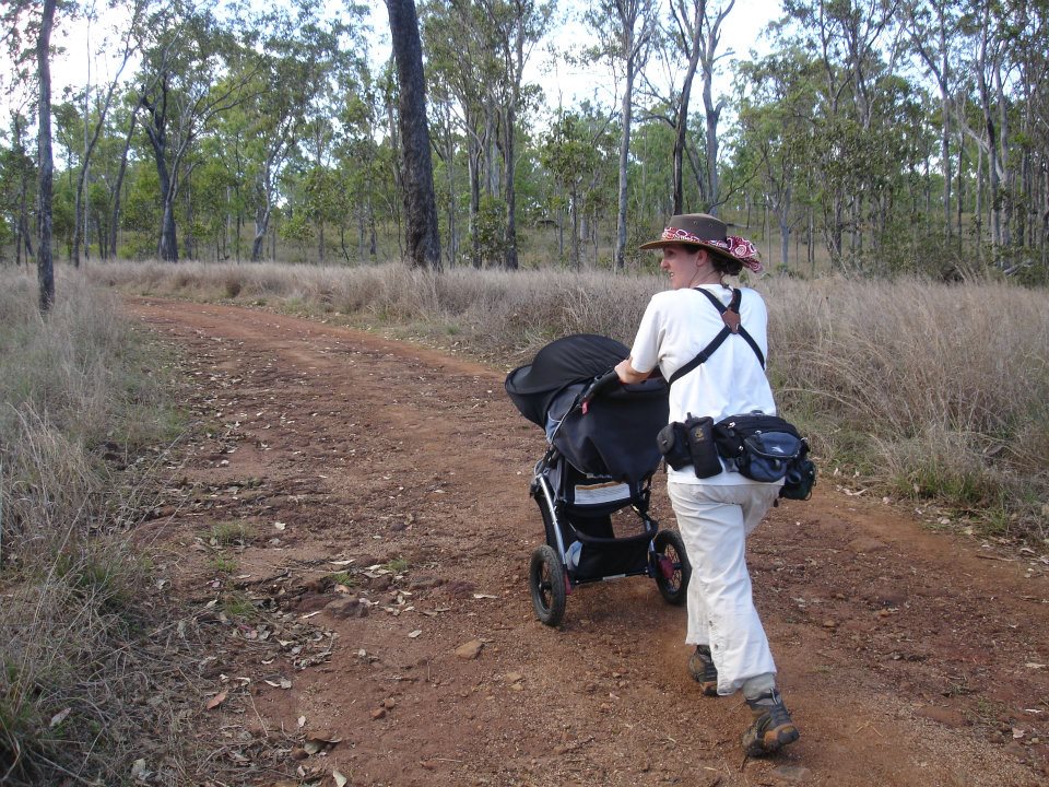 Misty conducting field research in Australia while pushing a baby stroller with one of her kids in it.